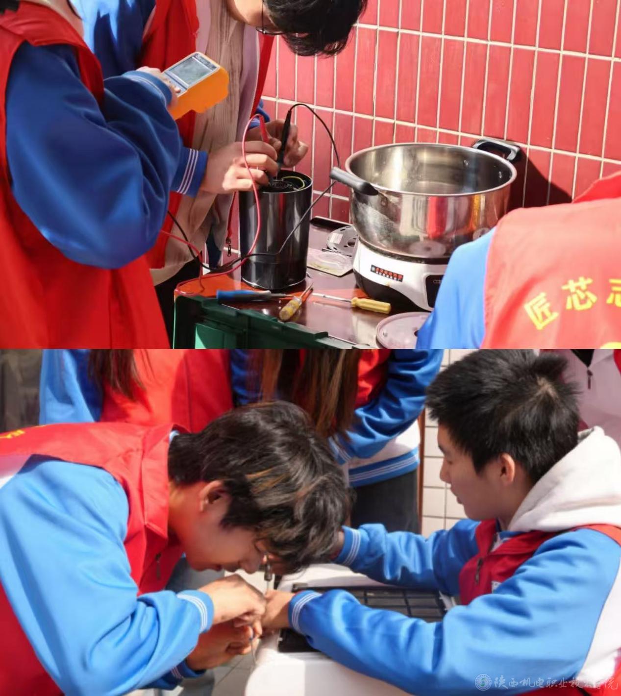 “家电维修社团”在两个社区分别现场搭设服务台,为居民免费检修电饭煲、电水壶、插线板、收音机等小家电,耐心排查故障、更换元件、调试运行,同步讲解安全用电与日常保养知识,把专业技能转化为惠民实效,赢得居民连连点赞。